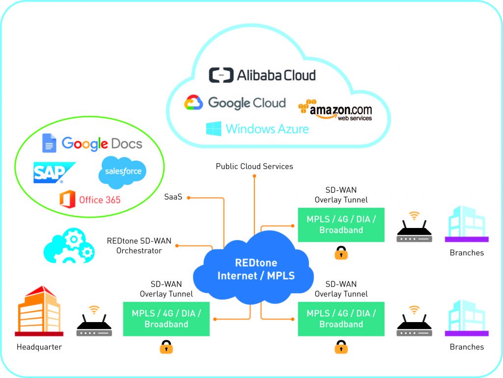 REDtone SD-WAN enables secure and seamless connectivity between headquarters, branch offices, cloud platforms, and SaaS applications through a single, intelligent network. By leveraging REDtone Internet or MPLS as the core, businesses can connect using multiple access options including MPLS, 4G, DIA, and broadband, all managed through secure SD-WAN overlay tunnels. This architecture allows users to reliably access public cloud services such as Alibaba Cloud, Google Cloud, AWS, and Azure, as well as SaaS applications like Microsoft Office 365, SAP, Salesforce, and Google Docs. With centralized management via the REDtone SD-WAN Orchestrator, organisations gain greater visibility, improved performance, and enhanced security across their entire network.